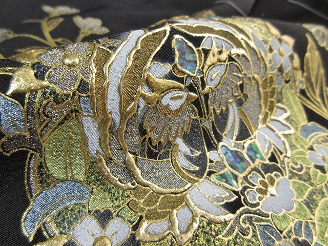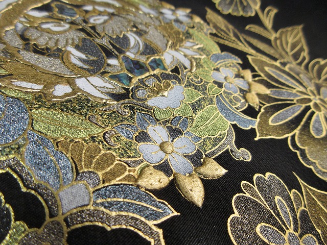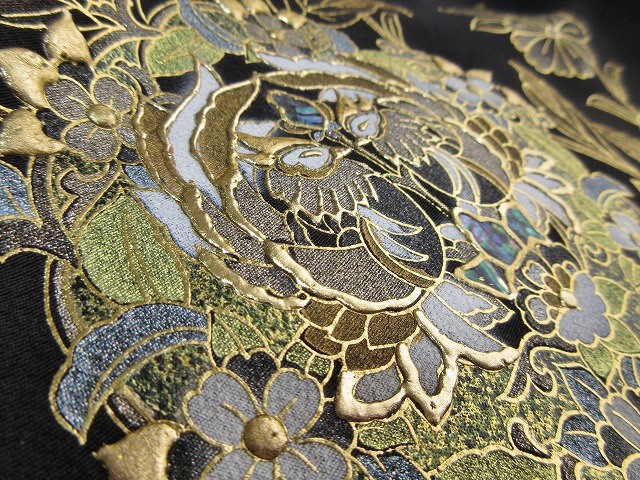 砂子技法で表現された立体感のある唐花の、鳳凰文に見られる盛り上げ箔の加工など細部に渡り繊細に仕上げられております。