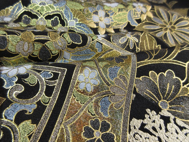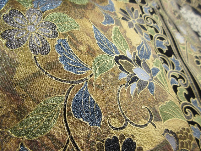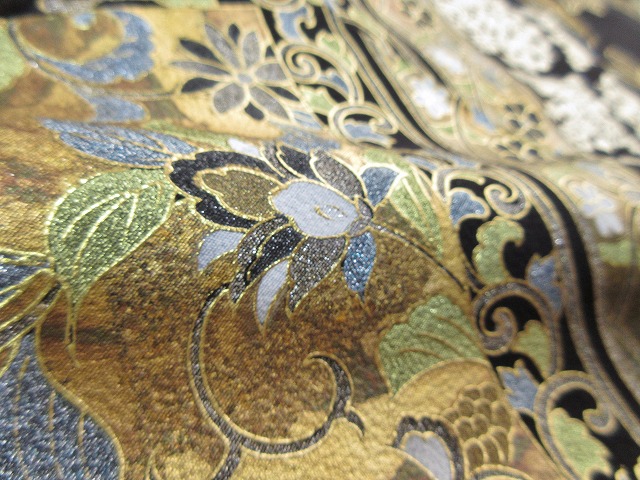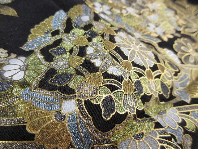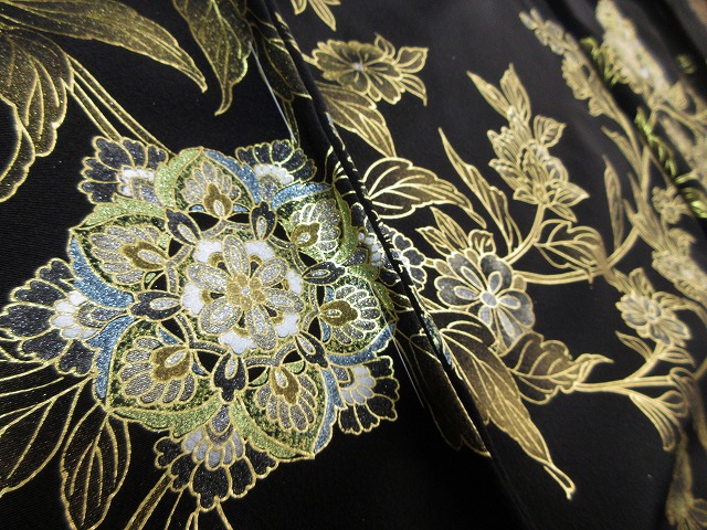 この留袖は金色の金泊が多用されており、所々に抑えられた緑、青などのアクセントが施されています。