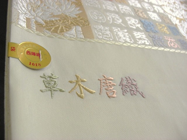 | 素材 | 絹100% 金属糸以外 長さ約4.5メートル 京都西陣謹製 西陣織物工業組合証紙No.1618 |