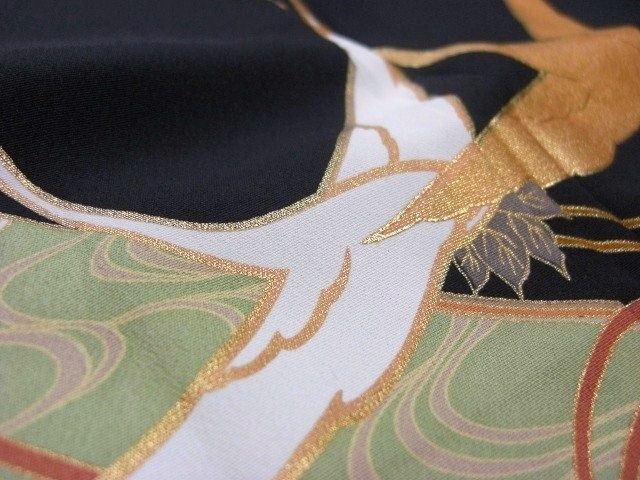 金銀の古典的な鶴の柄と金の引き箔がはっと目を奪われる格式高い黒留袖です。