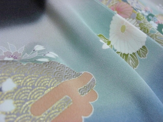 白と青のぼかし染めを背景に、熨斗、扇、菊、牡丹などの古典美と愛らしい花を見事な挿し色で描いた図案ですので華やかさと格式をお求めになられる新郎新婦のお母様も安心してご着用頂けるお品となっています。
