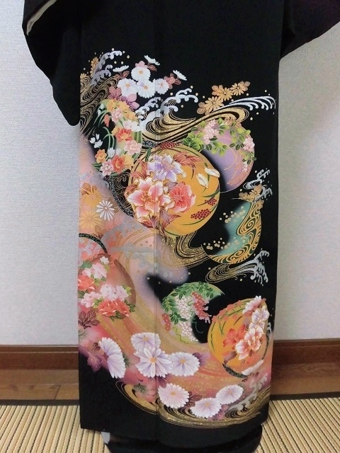 | 商品名 | 黒留袖レンタル83 (本金箔使用!京友禅創作黒留袖/波頭に花丸文)+往復送料込み 23,000円ランクアップ袋帯付き