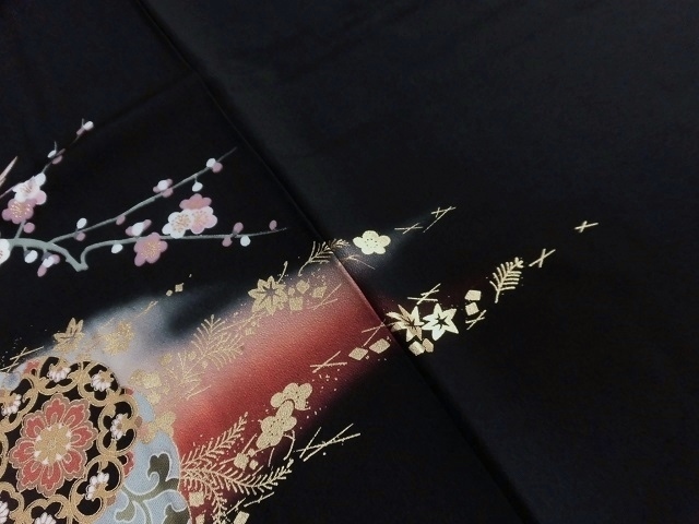 柄付けの多い豪華絢爛な留袖もいいですが、この作品のような黒の無地場を生かした図案は柄のコントラストが際立ちます。