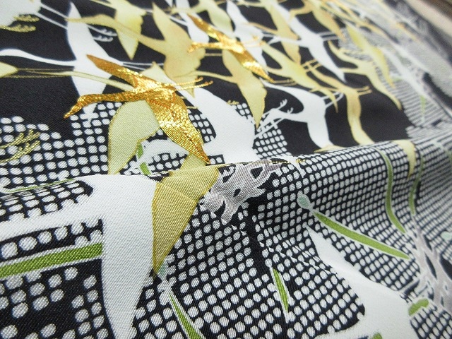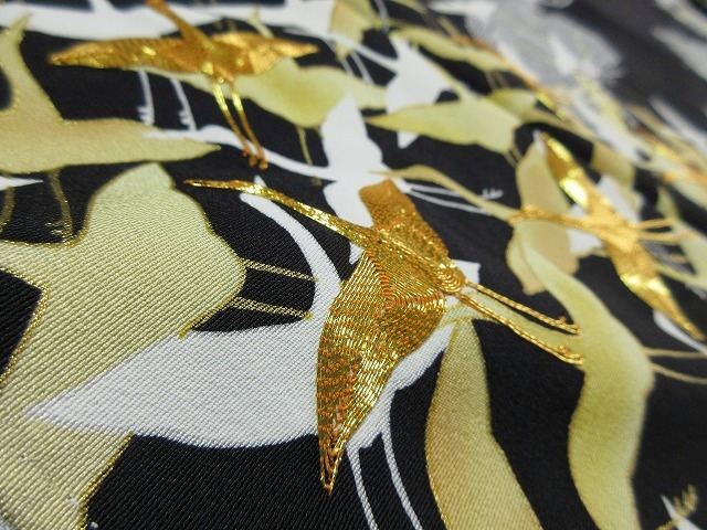 白い鶴は胡粉、金の鶴はぼかし染めと金彩友禅、刺繍は金駒と呼ばれる加工が施されています。