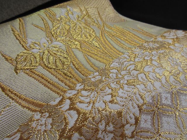 立波文を挟むように清楚な白い菊文とアヤメ、その付近に桜の小花がデザインされた格調高く風流なデザインの礼装用袋帯です。