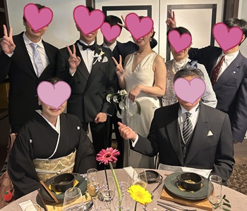 ~この度は、私達の大事なお祝いの日に「京都着物さくら」さんとのご縁があり、とっても素敵な留袖を着て参列できた事を母と共に大変嬉しく思っております。 ネットレンタルという事ではじめは不安もありましたが、実際にお着物を手に取って見れたり小さな悩みにも返信下さったりと、終始寄り添っていただけた源本さんに感謝の気持ちでいっぱいです。 新郎の会社の上司にも褒められ大変嬉しかったです! また機会がありましたら、是非よろしくお願いいたします。 弟と母の写真と、私の兄妹と新婦さんの妹さんとのショットです。 写真で振り返っても本当に綺麗で豪華なお着物でした。 着付け担当の方にも褒められてとっても嬉しかったです。 この度はありがとうございました。