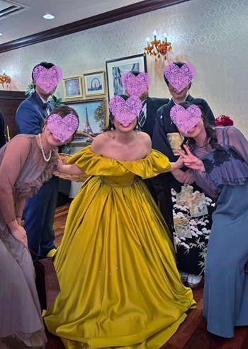 ~今回は素敵なお着物をお貸し下さりありがとうございました! 水色いいね、似合ってるなどお褒めの言葉をたくさんいただきました。 八坂神社では沢山のインバウンドの方にカメラを向けられ、なんだか不思議な気持ちでした。 新郎新婦も喜んでくれていたので本当に良かったなと思っています。 直前の帯の変更にもご対応頂きありがとうございましたやはり金色にして良かったと思っています。 ちゃんとカメラマンさんが撮ってくれた写真ではないですが添付しておきます。 この度は本当にありがとうございました。 また機会があればお世話になりたいと思いますのでよろしくお願い致します。
