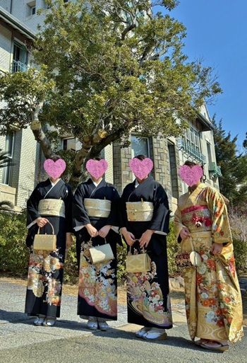 M様は留袖レンタル102「日向の流水」(右側)、そして左に向かって黒留袖レンタル62、96でございます。 神戸迎賓館の情緒が感じられる背景に、お着物姿の皆様があまりに美しく感動しました♪ ご来店頂きました際も皆様明るく陽気な方々で、またお着物にも詳しく私たちも大変楽しい時間を過ごさせて頂きました♪ 式後にお送り頂きましたこの素晴らしいお写真。 画像販売サイトのP〇〇〇Aに出品でもすればかなりの数を販売できそうな素晴らしいお写真だと思いませんか? 冗談はさておき(それほどに素晴らしいお写真だと感じたことを伝えたかった)、この貴重かつ素晴らしいお写真をわざわざお送り頂きましたM様に心より感謝を込めてお礼申し上げたいと思います。 いつまでも皆様のご幸せが続きますように。 いつまでも皆様の温かな関係が続きますように。 心からお祈り申し上げます。 また皆様の元気なお顔を拝見できる日を心待ちにしていますね♪ この度はご利用頂き誠にありがとうございました。
