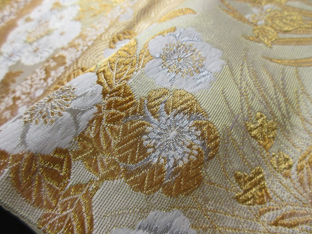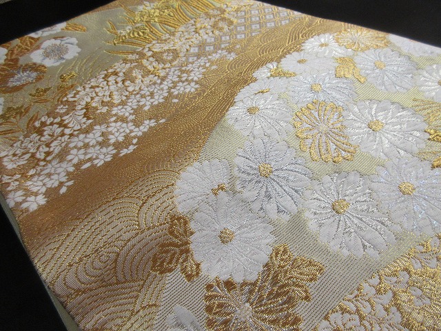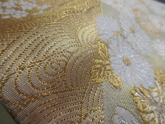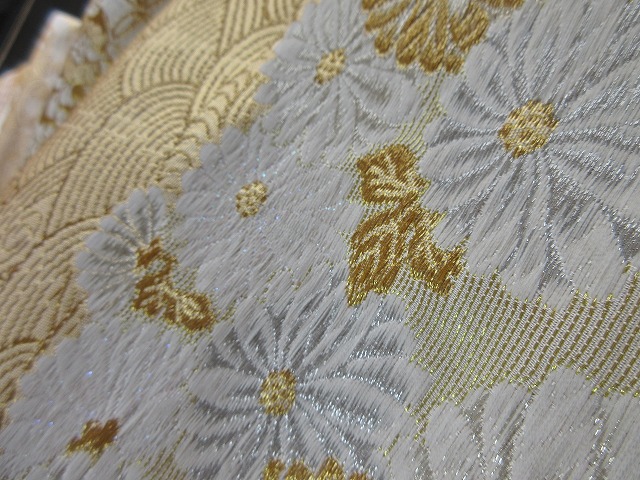 白い可憐な菊の花は精巧に織られており、アクセントに銀糸が使用されているようです。
