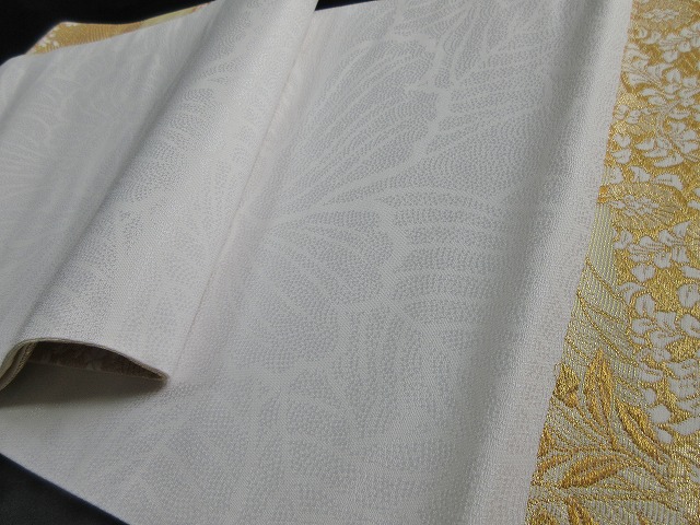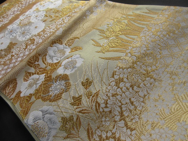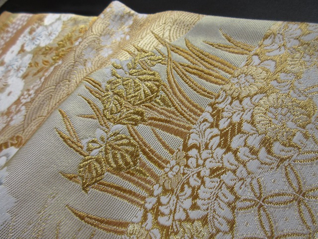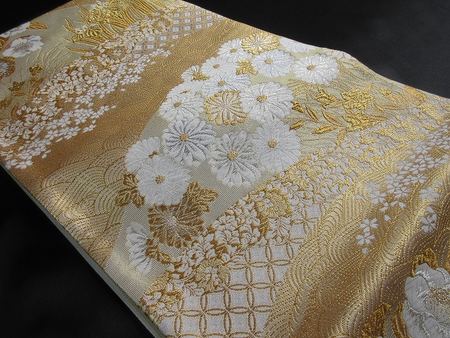 立波文を挟むように清楚な白い菊文とアヤメ、その付近に桜の小花がデザインされた格調高く風流なデザインの礼装用袋帯です。