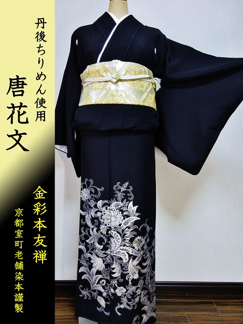 | 商品名 | 黒留袖レンタル190 (京都室町老舗メーカー謹製黒留袖 唐花文/金彩友禅 ~丹後ちりめん使用~)+往復送料込み 12,000円ランクアップ袋帯付き |