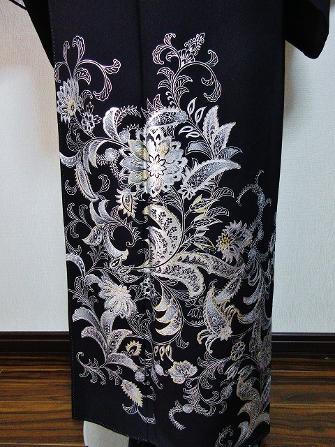 また黒地に対して直接柄が染められますので遠くから見た時の柄の存在感も素晴らしく、金色の帯とを合わせることによりフォーマル感が際立ちます。